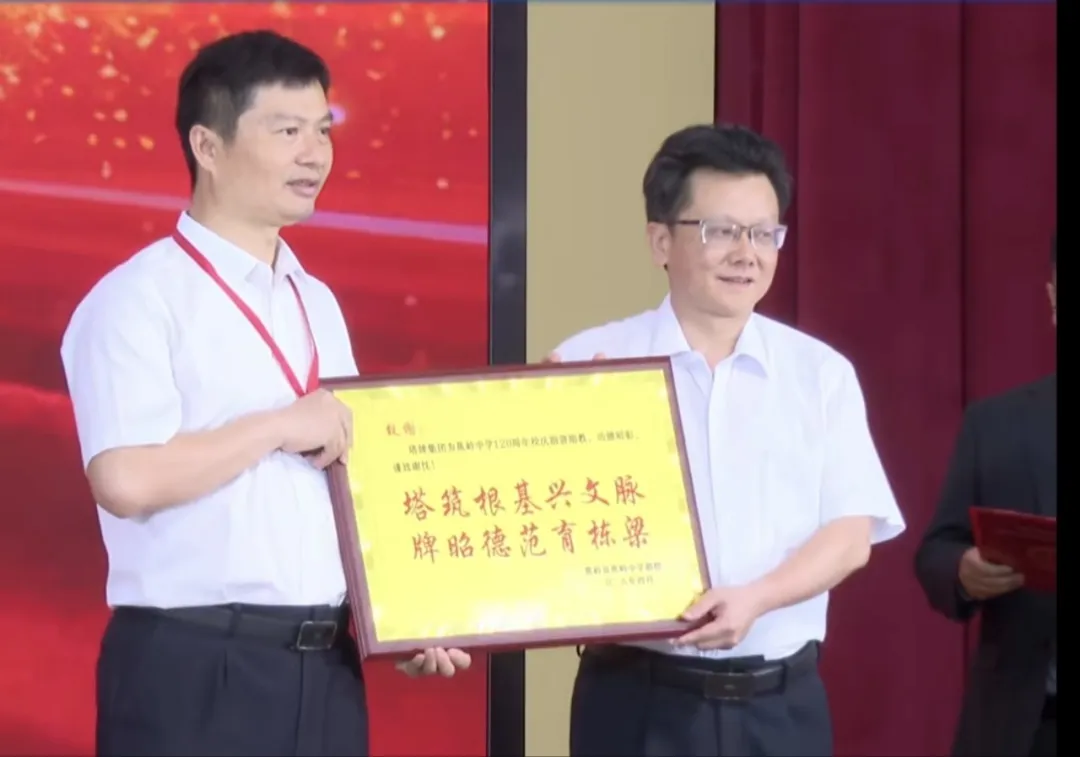 回顾了蕉岭中学自1906年由先贤丘逢甲先生创办以来的百廿载初心如磐、砥砺深耕的历程,盛赞学校始终践行“诚敬勤谨”校训,培育了一代又一代胸怀家国的优秀学子。塔牌集团许多员工及员工子女都曾在蕉中求学成长,蕉中的校风、教风、学风早已融入了塔牌的精神风貌。这份特殊而深厚的情缘,让塔牌始终与蕉中同频共振。塔牌集团将继续以绵薄之力,为蕉岭中学的新征程添砖加瓦,为梅州教育的高质量发展注入新动能。并勉励蕉中学子不负韶华、逐梦远航,希望越来越多的蕉中学子从蕉中出发,沿着塔牌大道,走向全国、迈向世界!